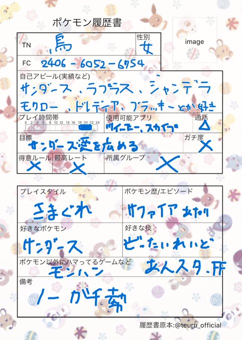 ポケモン履歴書でTwitterを彩ろうソード&シールド 年1月24日 今日はちょっと変わった趣旨の記事。 Twitter界隈には「ポケモン履歴書」というものがあります。 ガチの履歴書みたいなもんです。 こんな感じの書式をしています。 探せば他の書式も